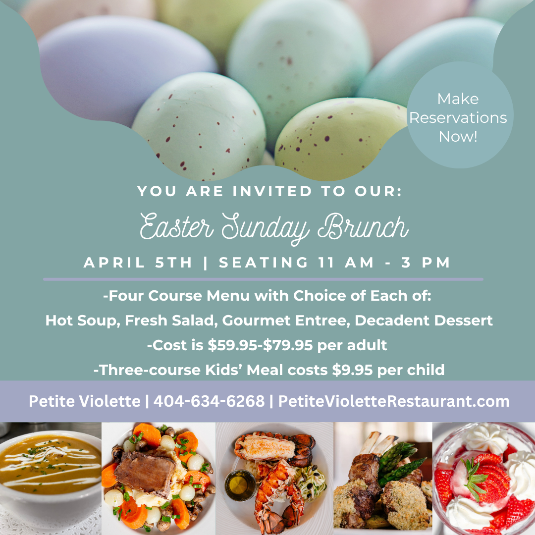 On April 5th, join us for Easter Sunday Brunch: a four-course menu featuring a choice of each of savory soup, crisp salad, gourmet entree, and delicious dessert. A three-course kids’ menu features choice of chicken tenders or pasta, served with a fruit cup and ice cream sundae. For required reservations, call 404-634-6268, for seatings 11 a.m. to 3 p.m.