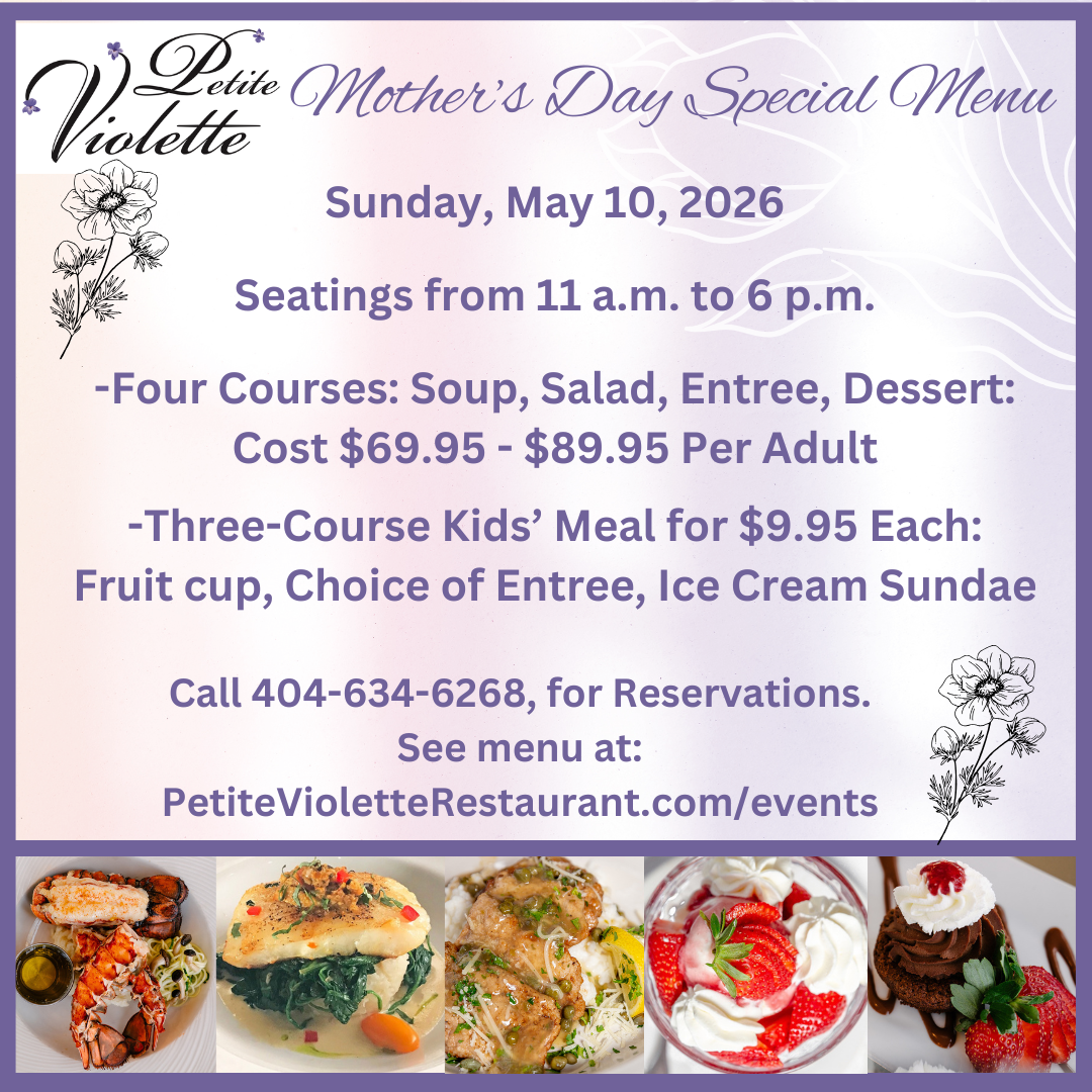 Join us on Mother’s Day, Sunday, May 10th, for a four-course menu to please any mother. We’ll do the cooking, serving, and cleaning, while your mom or your kids’ mom sits back and relaxes. Enjoy choice of each of hot soup, fresh salad, gourmet entree, and decadent dessert, with prices varying from $69.95 to $89.95, based on entree selection. We also offer a perfectly portioned kids menu for $9.95, featuring choice of chicken tenders or pasta, served with a fruit cup and ice cream sundae. Make reservations now, at 404-634-6268, for seatings from 11 a.m. to 6 p.m.