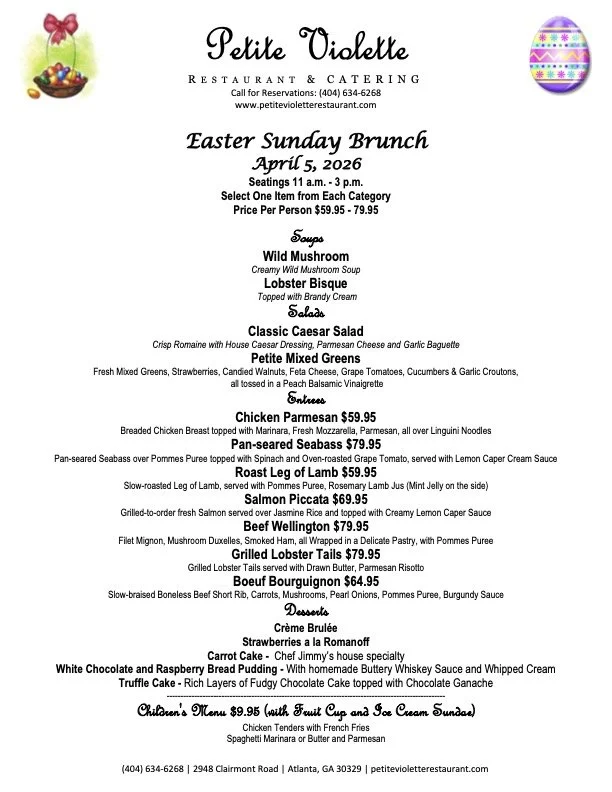Annually, the restaurant also offers special feature menus like Mediterranean, Cajun Creole, Wild Game and Oktoberfest, as well as holiday menus including New Year's Eve, Valentine’s Day, Easter, Mother’s Day and Thanksgiving, in the main dining room. Year-round, whatever the occasion, Michael, Anthony and the staff at Petite Violette carry on the Gropp family’s proud tradition of serving the residents and visitors of Atlanta with a one-of-a-kind dining experience, exceptional food, attentive service and a variety of options that few others can offer.