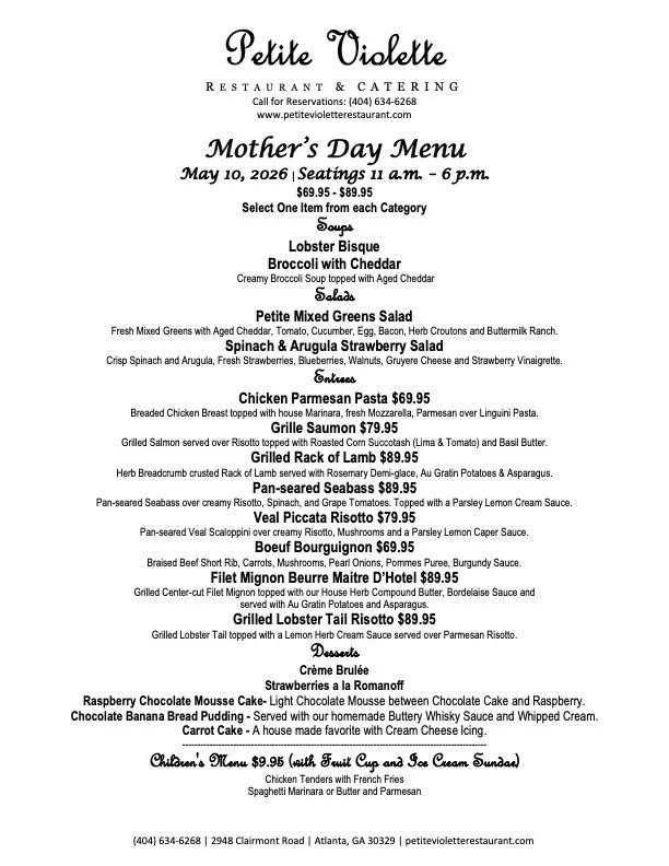 Join us on Mother’s Day, Sunday, May 10th, for a four-course menu to please any mother. We’ll do the cooking, serving, and cleaning, while your mom or your kids’ mom sits back and relaxes. Enjoy choice of each of hot soup, fresh salad, gourmet entree, and decadent dessert, with prices varying from $69.95 to $89.95, based on entree selection. We also offer a perfectly portioned kids menu for $9.95, featuring choice of chicken tenders or pasta, served with a fruit cup and ice cream sundae. Make reservations now, by calling 404-634-6268, for seatings between 11 a.m. and 6 p.m., as space fills quickly.